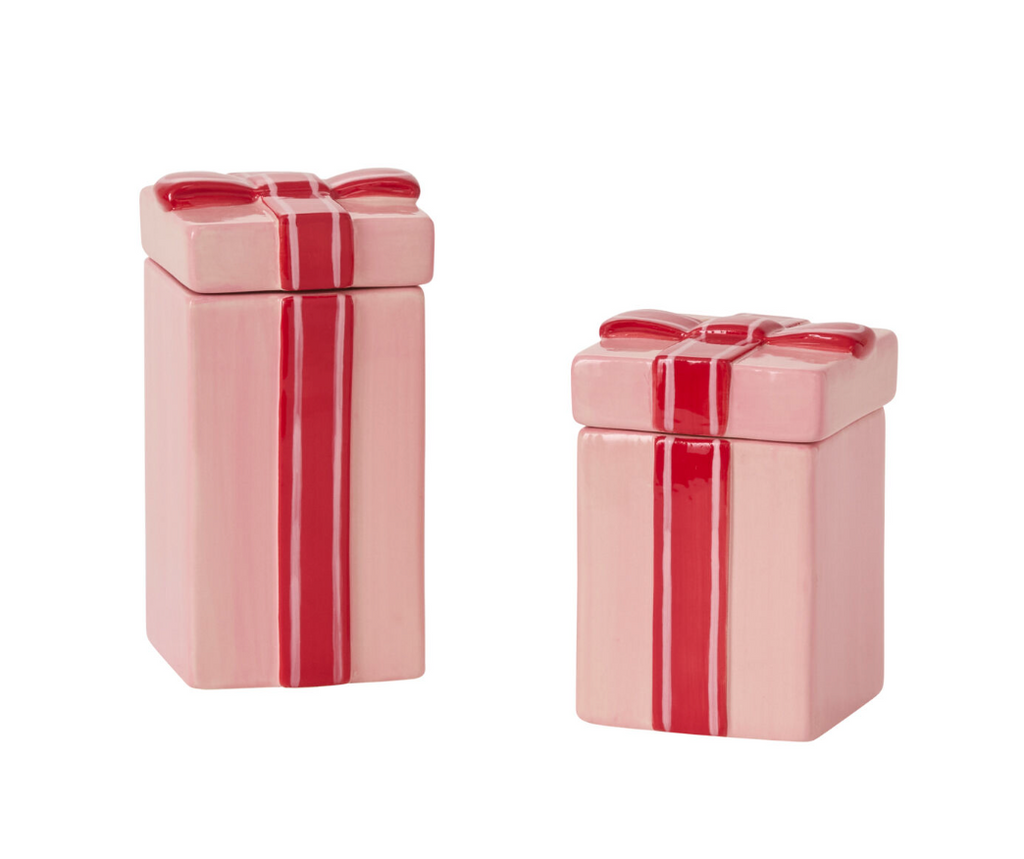 Wrap holiday treats and trinkets with care in these two cheerful ceramic pink canisters with dime...