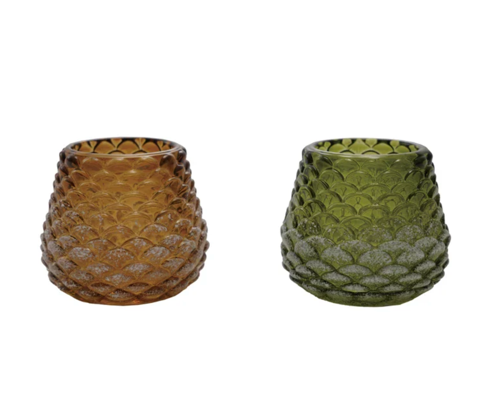Enhance your decor with this glass pinecone-shaped tealight/votive holder. Featuring a snow finis...