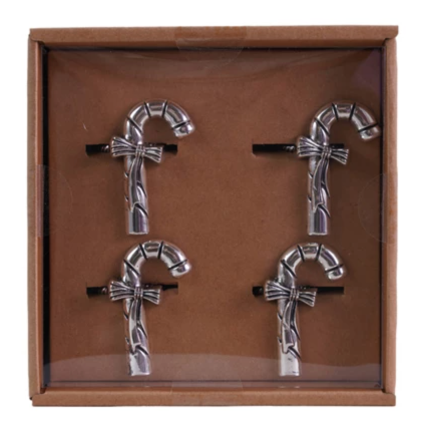 Celebrate the season with this boxed set of 4 zinc alloy napkin rings featuring a festive candy c...