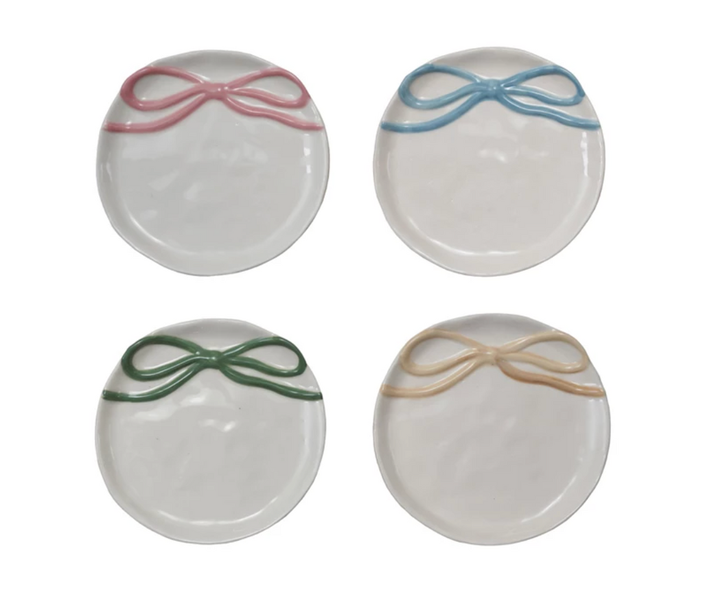 This stoneware dish features a charming bow design and is available in four colors, combining dur...