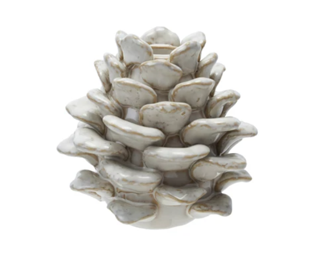 This stoneware taper holder features a handcrafted pinecone design with a cream-colored reactive ...