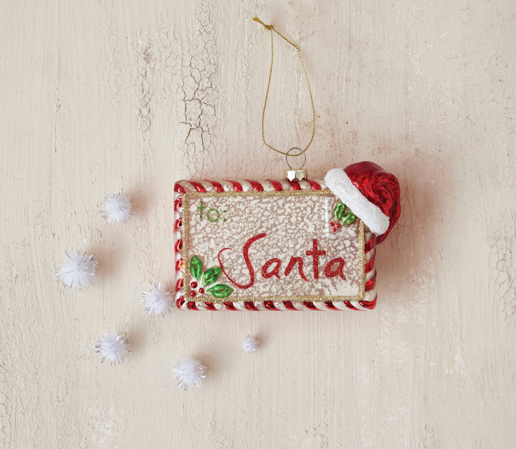 This glass 'Letter to Santa' ornament features a vibrant red and green design, accented with glit...