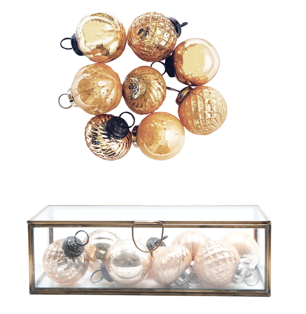 These 8 mini mercury glass ornaments have an antique gold finish in a soft blush hue adding a del...