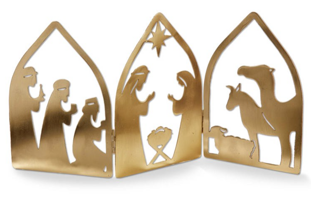 This beautiful folding nativity scene is made from 100% iron and features a classic brass finish....