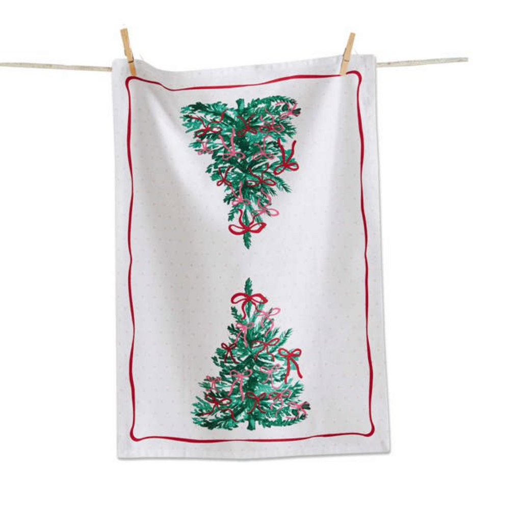 A festive and cheerful dishtowel adorned with pink bows and Christmas treess, perfect for holiday...