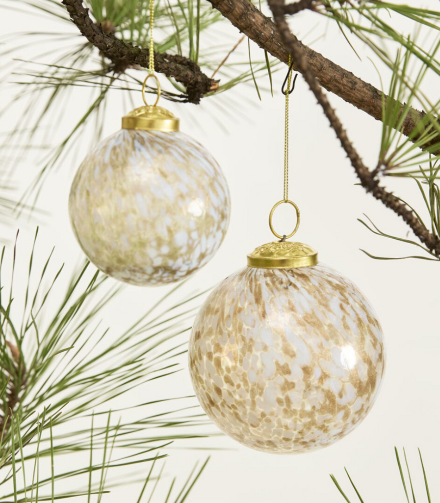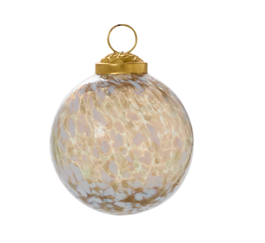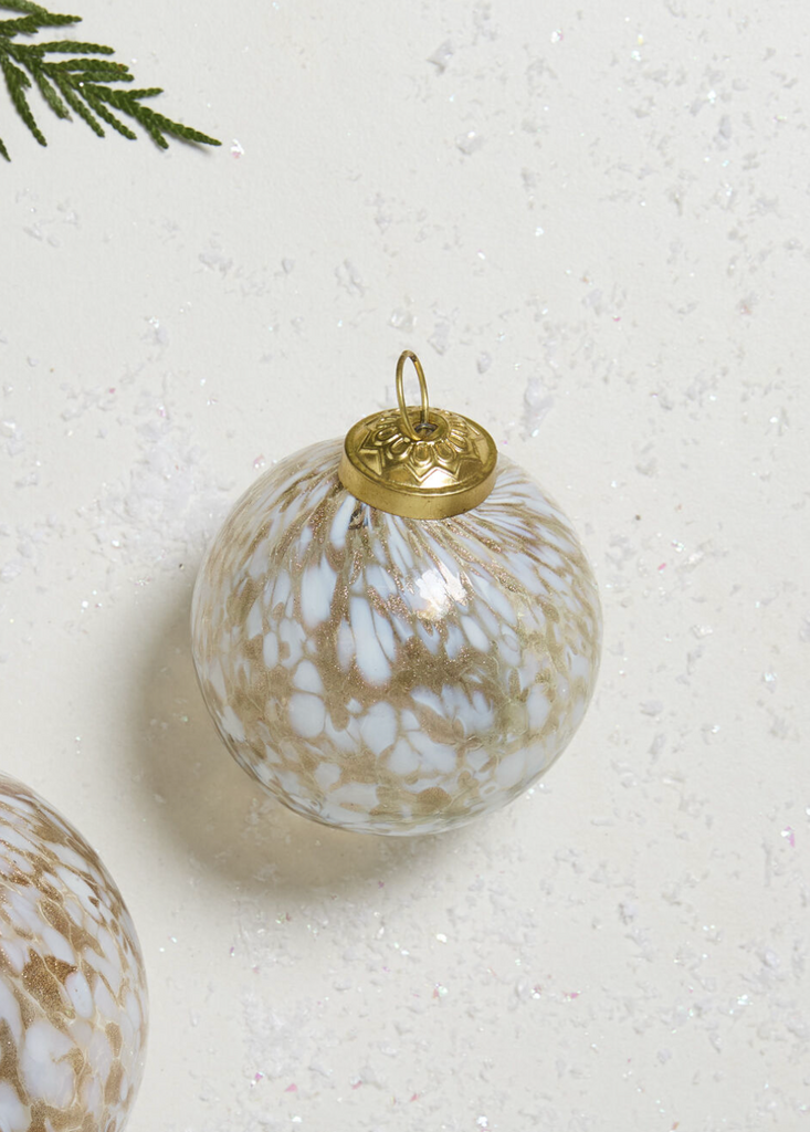 Create a classic, cozy Christmas tree with this elegant ornament. Available in two sizes, each globe shaped ornament has a sturdy metal cap, and features a blend of metallic gold and cool white flecks that wrap around the whole ornament. Each is a unique mouth blown work of art that adds a festive shine when layered in amongst string lights.